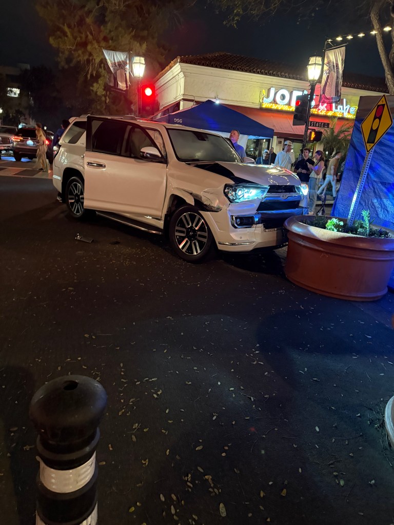 Three separate vehicles were involved in the incident, with the driver of a larger white truck loaded with a full trailer that appeared to be lawn debris, being the cause of the incident. The loud collision we heard? The white truck ramming the white SUV in front of them, causing the vehicle to hit the car ahead of it, before smashing into the large planter that functions as a barricade. The car was fortunately stopped by the barricade, as a few feet away was a street vendor setting up for the night.